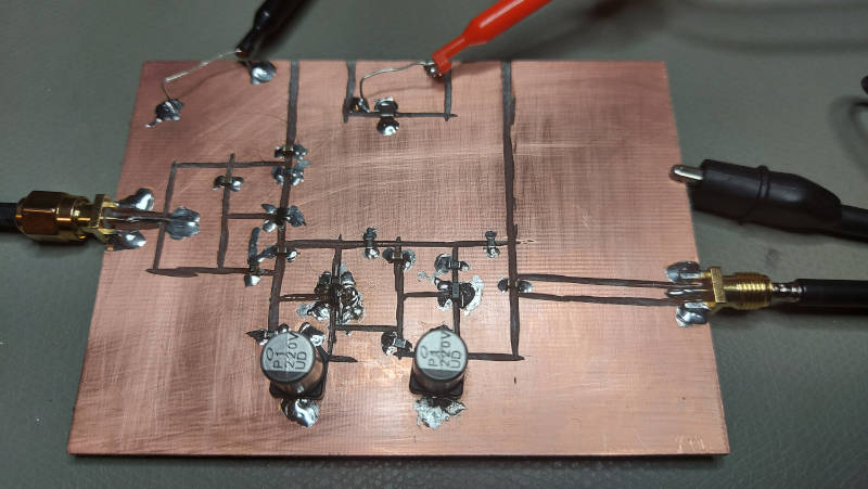The discontinuities at 10 and 20 MHz might be due to compression/distortion at those those levels. To conclude, the gain of the amplifier is severely decreasing in frequency. (This is a feature of the design not of weaknesses in my build, it is confirmed by simulations in LTSpice.) But the amplifier does provide about 43 dB at 30 MHz, sufficient to activate the frequency counter (?).