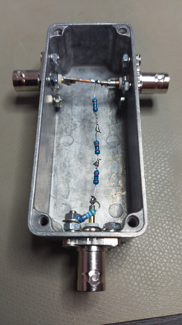 Hayward and Larkin’s design is built into a die cast aluminium box with connectors on three sides. I used the same type of box (sourced from ebay), and put BNC connectors (with flanges) on. I have built a version aiming for 40 dB attenuation, as in this picture: