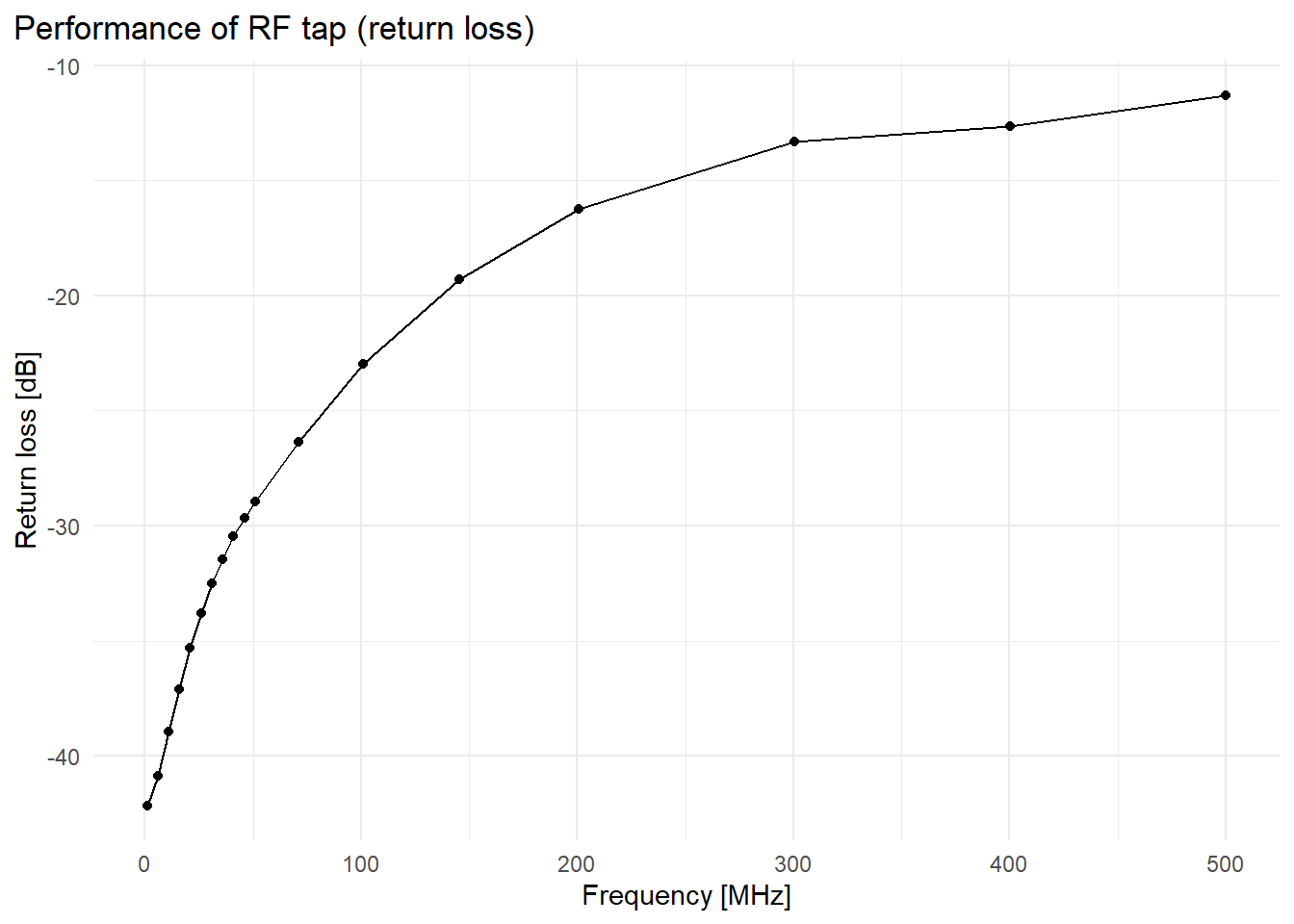 I reconfigured the testing setup: Kept the 50 ohm termination on the output, but connected the NanoVNA for a two port measurement - from the input port to the tap (the attenuated output). I recorded the