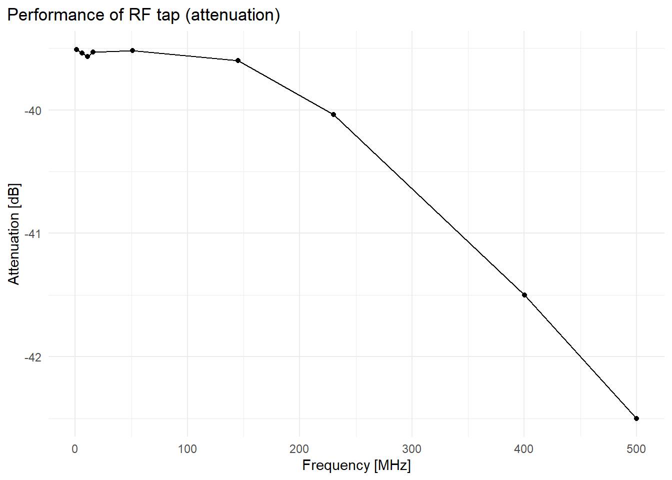 Attenuation is very close to the nominal 40dB. This curve looks dramatic, but considering the scale, attenuation is flat up to and including VHF, only drops off by a couple of dB at 500 MHz.