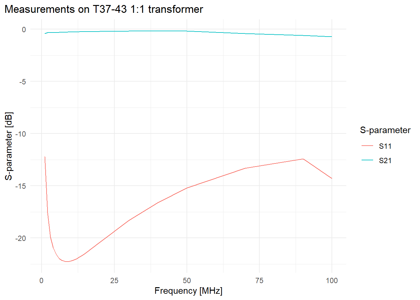 I used to nanoVNA to measure the return loss and the attenuation of this transformer over 1 to 100 MHz (but I’m most interested in what happens around 10MHz).