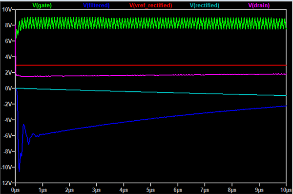 From this picture it is clear that at initial startup, the circuit is constrained by the voltage available at the drain because of the choke on the supply. With a bit more time, that voltage level eventually get to where the MOSFET can amplify (around 70 us), and we see wild voltage swings at the drain and also the filtered output. The rectified output reaches almost 12V.