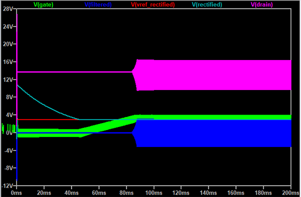 When the rectified filtered output reaches the reference level, for a while the bias at the MOSFET gate slowly starts to ramp up. At around 85ms, we see some serious amplification, and a few ms after that the circuit appears to have reached steady state with almost 6V pp at the filtered output. The circuit keeps its regulated level for the rest of the simulation period.