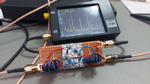 I built it twice. The first time I wound the transformers on T50-6 cores and used 1n4148 diodes. This didn’t work very well. I concluded after a while that there were two issues working against it: First, the inductive reactance in parallel with the load would be low, loading down the generators. Second, a large drive level would be necessary to turn two 1n4148 diodes on at the same time.