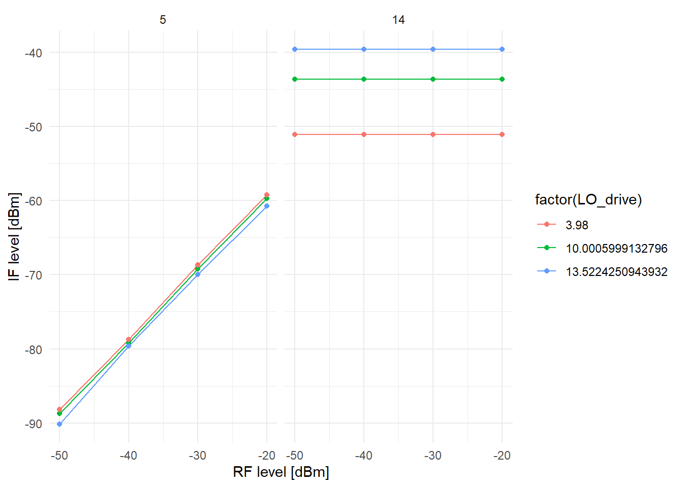The main mixing products depend on the RF level, but not so much on the drive levels that I’ve been looking at: