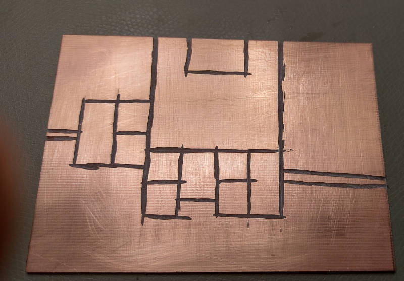 Esthetically, this is only a partial success. And since my Dremel cut-off wheel was fairly large (a diameter of 38mm), it was difficult to avoid overshooting the cuts. And for Q2 and Q3, the T-joint for the transistors have these overshoot where the collector is intended to go. This made it add some wires to the installation of these transistors, and the end result is not beautiful. But after some fiddling around, it seems to work in this fairly ugly state (with 0805 for the capacitors and resistors):