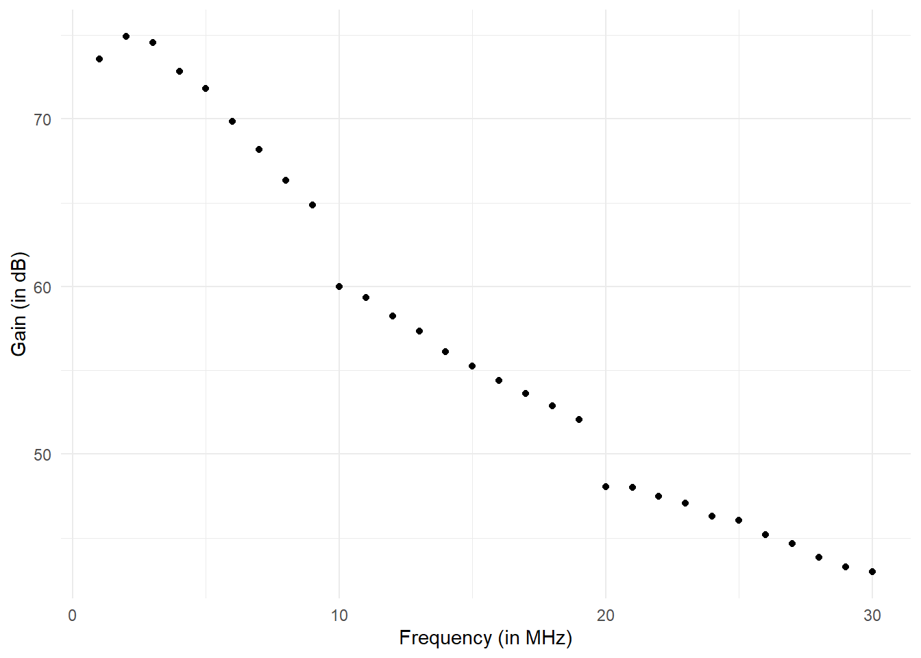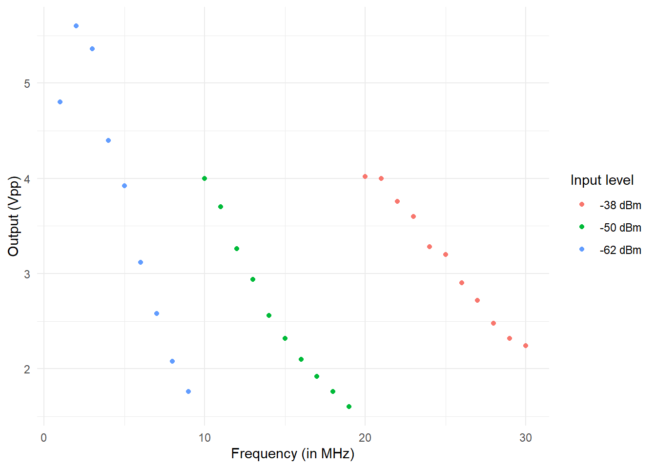The discontinuities at 10 and 20 MHz might be due to compression/distortion at those those levels. To conclude, the gain of the amplifier is severely decreasing in frequency. (This is a feature of the design not of weaknesses in my build, it is confirmed by simulations in LTSpice.) But the amplifier does provide about 43 dB at 30 MHz, sufficient to activate the frequency counter (?).