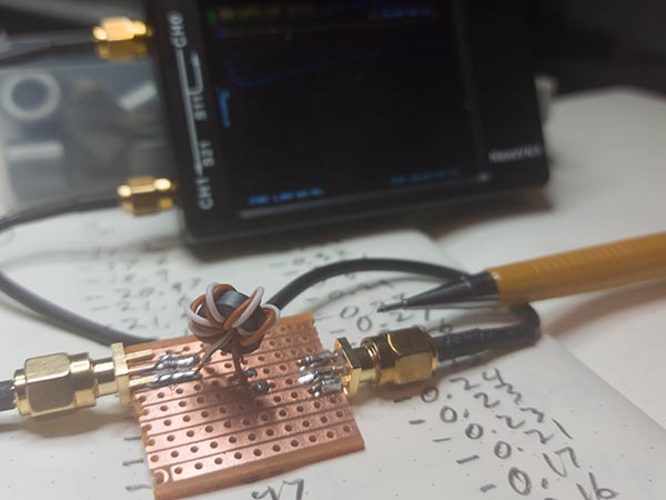 I’ve been thinking about an application where I want to provide transformer-isolated outputs (a 10MHz reference distribution amplifier). But I really find working with enamel coated (“magnet”) wire hard - stripping the enamel to solder to the wire is hard, and it is hard to keep track of which wire ends belong together. So I thought, I have a spool of single strand CAT-5 cable for installation, what if I used a twisted pair from this to wind the transformer? I probably couldn’t get as many turns on to a small core, but I decided to try. I managed to put 6 turns onto a T37-43 core, and soldered it to a small stripboard fixture with SMA edge-mount connectors: